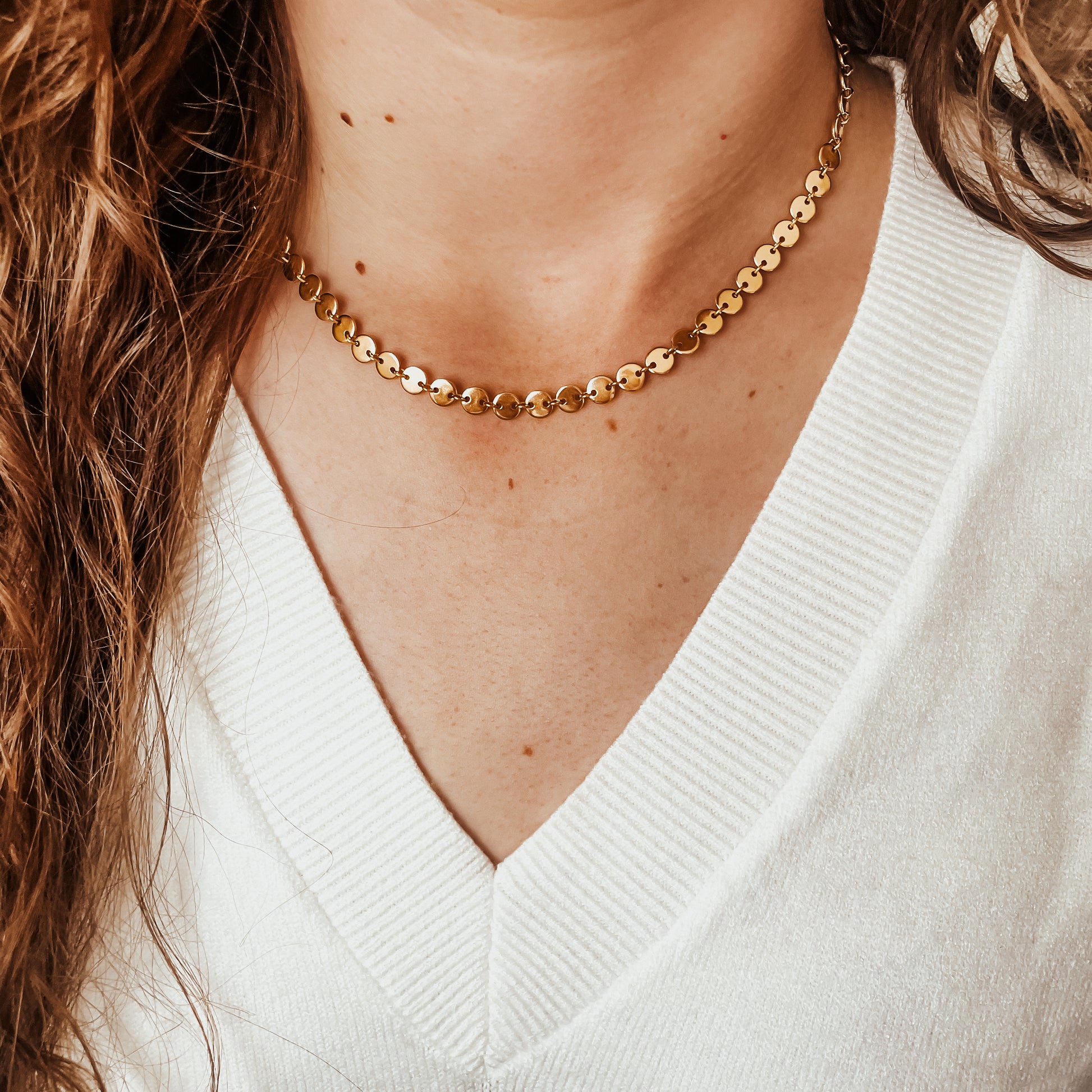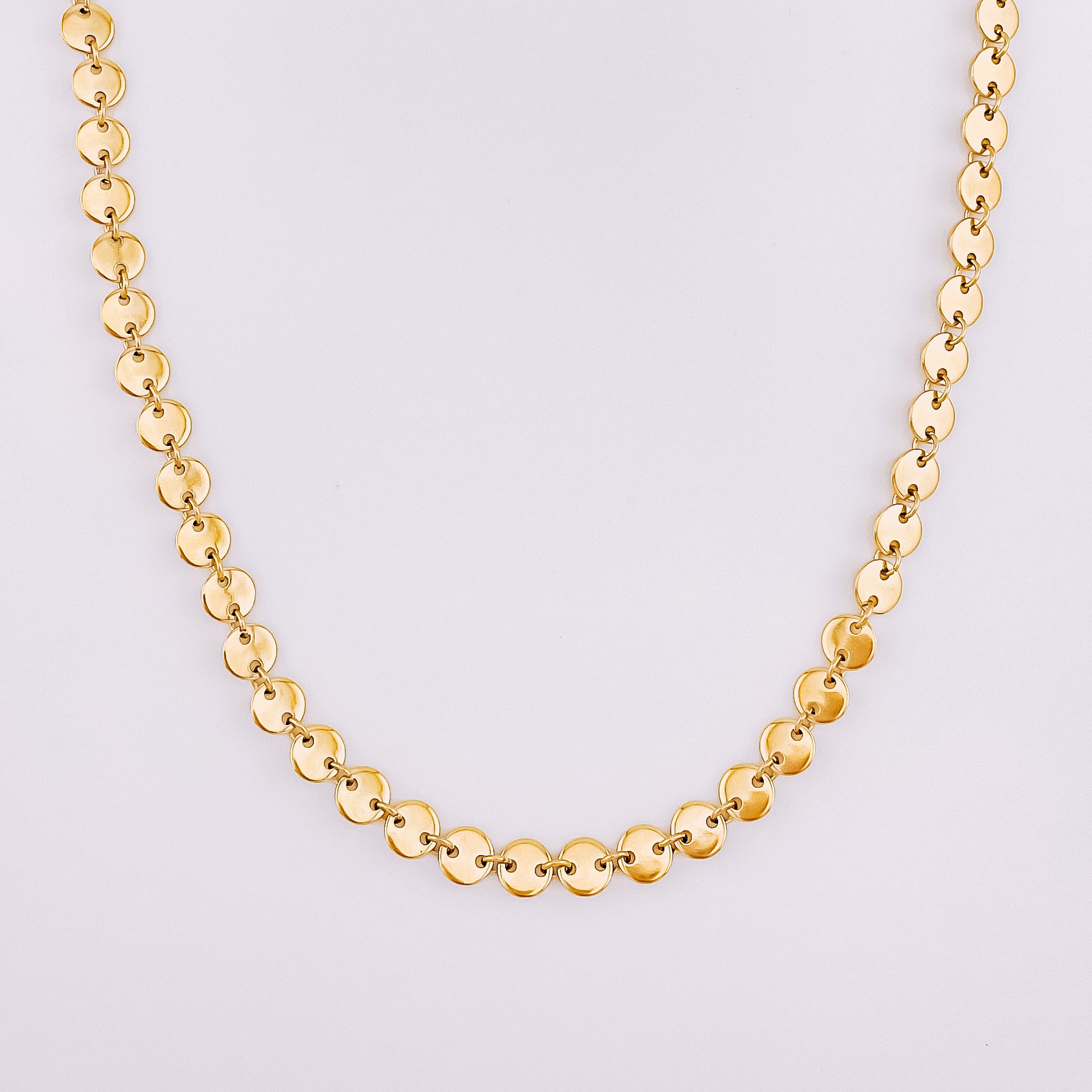 The Halo necklace showcases a sleek, polished disk chain that catches light beautifully. The simple yet sophisticated design makes it perfect for layering or wearing on its own. It's timeless, elegant shine complements any look.