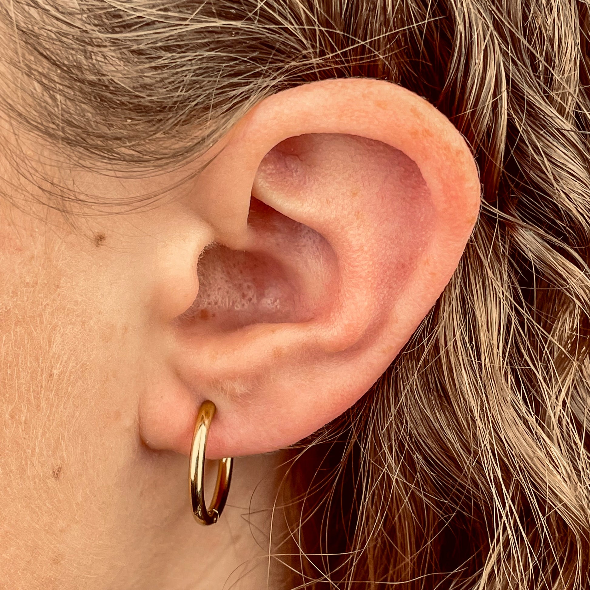 These 14 mm gold-plated minimalist hoops offer the ideal blend of subtle elegance and everyday wearability. With their polished finish and classic silhouette, they’re designed to elevate your essentials without overpowering your style.